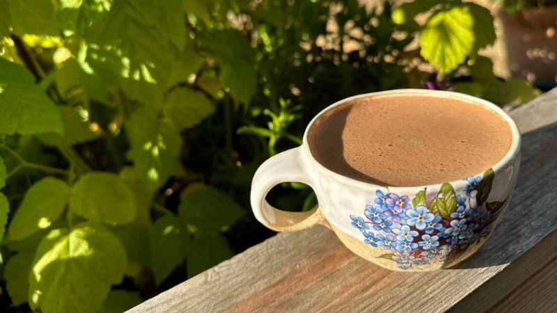 Sedíte u stolu s kávou.